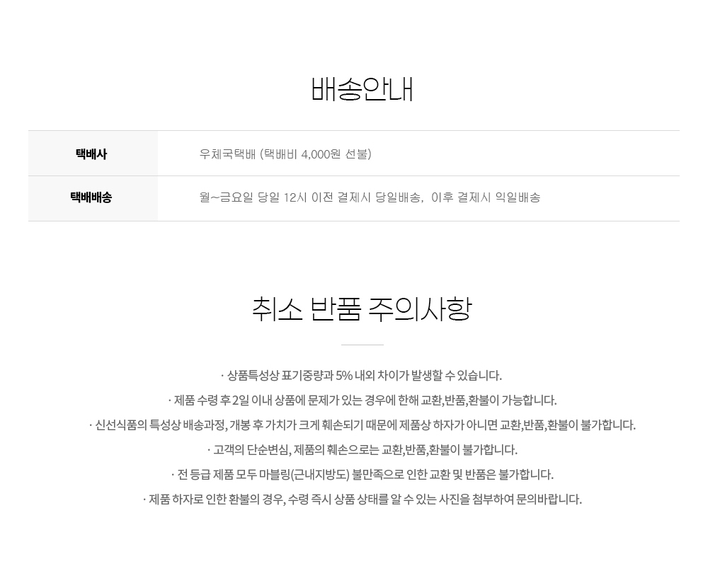 -신선식품의 특성상 배송과정, 개봉 후 가치가 크게 훼손되기 때문에 제품상 하자가 아니면 교환, 반품, 환불이 불가합니다.